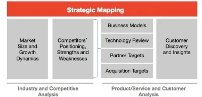 A market map is a structural representation of the market environment in which your product or service operates in. A well-constructed market map can be insightful, flexible, and will serve many strategic needs. It can be utilized to develop product and portfolio strategy, competitive strategy, identifying partnership and acquisition candidates, and providing feature level customer insights. In this example of a market opportunity map for Corporate Governance, there are two high-level tiers, Research & Advisory and Investment Tools and Data. As the map moves to the right, to Tiers 3 and 4 it gets more and more specific at the feature level.